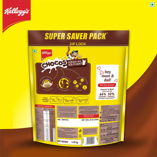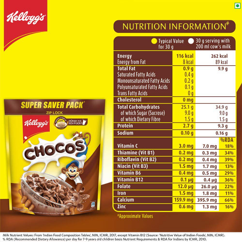 Chocos. • Kellogg's Chocos is a Solid & Nourishing food for your kids. One serve of 30g of Kellogg's Chocos has the protein & fiber of 1 Wheat Roti of 30g. It is enriched with 10 essential vitamins and minerals. • Kellogg's Chocos is high in calcium, low in fat and naturally cholesterol-free. • Crafted to make your kid's milk bowl tasty and fun, our chocolaty, crunchy and grain-based cereal makes for a tasty pick-me-up at school or as an evening snack. • A travel-ready food, Kellogg's Chocos are an ideal companion for snack boxes, after-school snacks, and busy on-the-go moments. Just add milk or enjoy it as a crispy treat straight from the box. |