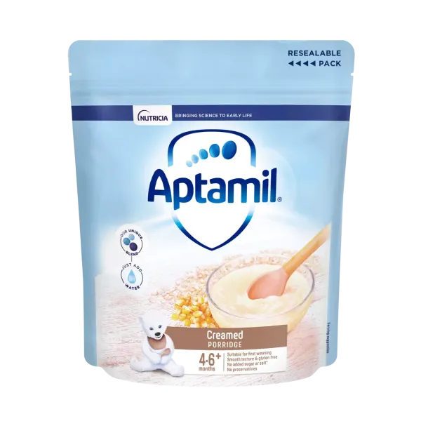 Aptamil Creamed Porridge 125g is a nutritious baby cereal made from milled corn and rice blended with milk, offering a creamy texture that’s gentle for babies starting their weaning journey. Suitable from 4 months onwards, it’s designed to be easy to digest and smooth in consistency, making it ideal as one of the first solid foods. The porridge is enriched with essential vitamins and minerals to support growth and development, while being gluten-free, vegetarian-friendly, and preservative-free. Packaged in a resealable pouch, it ensures freshness and convenience for parents.