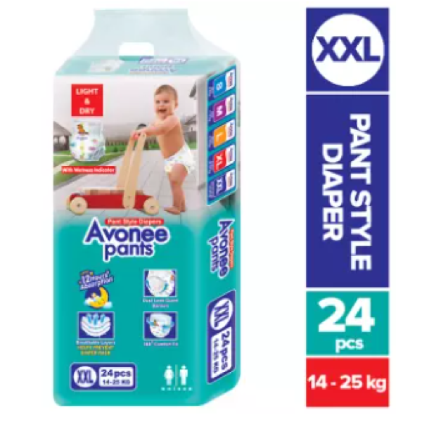 The Avonee XXL Pant Diaper 14-25Kg 24 Pcs is a premium diaper solution designed for active toddlers and young children weighing 14 to 25 kg. With its XXL size pant style, it offers a snug yet comfortable fit that allows your child to move freely while staying dry and protected. Perfect for both day and night use, these diapers provide superior leak protection, ensuring peace of mind for parents. Each pack contains 24 high-quality pant diapers, making it convenient for daily use at home or on the go. Proudly made in Bangladesh, Avonee diapers are crafted with safe, skin-friendly materials to keep your child comfortable and rash-free. Ideal for parents looking for reliable, easy-to-wear diapers for toddlers, the Avonee XXL Pant Diaper combines absorbency, flexibility, and convenience, making it a top choice in toddler hygiene products.