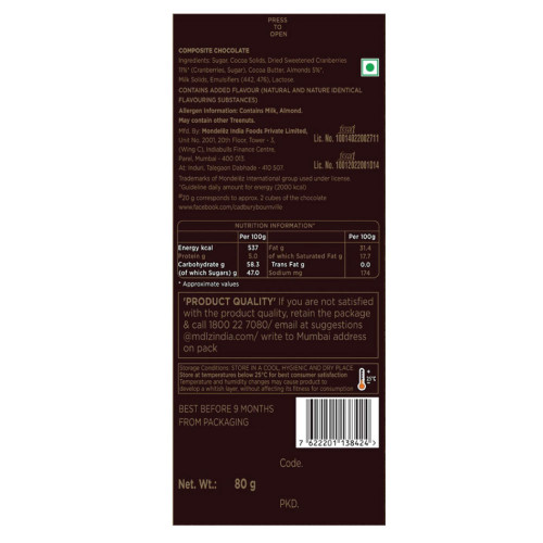 Cadbury Bournville Cranberry Chocolate Bar With Milk & Almonds 80gm