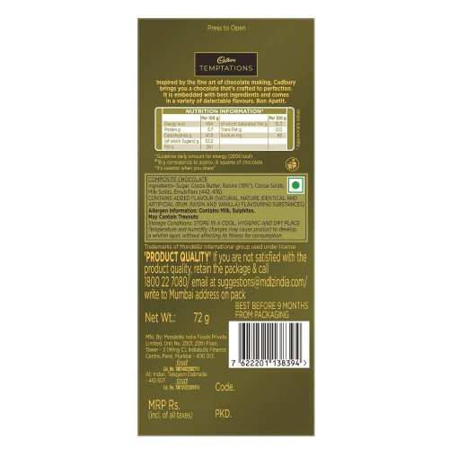 The best price of Cadbury Temptation Rum and Raisin Chocolate 72gm in Bangladesh is ৳ 225. You can buy the Cadbury Temptation Rum and Raisin Chocolate 72gm at best price from our website.