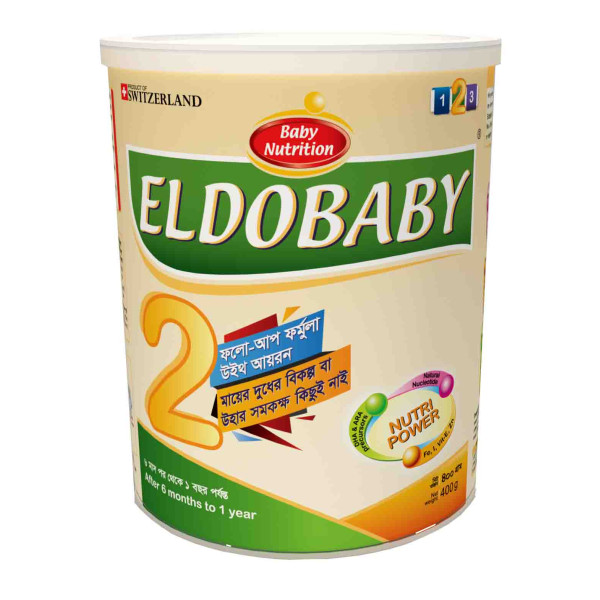 ELDOBABY 2 TIN 400 gm Infant Follow-up Formula is a carefully developed Stage 2 nutrition solution designed for babies aged 6 to 12 months, providing essential support during this important growth phase. With a net weight of 400 gm, this follow-up formula is enriched with nucleotides that help improve digestion and enhance the absorption of vital nutrients, supporting healthy development after 6 months of age. It contains iron, iodine, and antioxidants, which play a key role in boosting immunity and supporting cognitive and physical growth. Originating from Switzerland and produced in the Netherlands, ELDOBABY follows high European quality and safety standards to ensure reliable nutrition for your baby. This follow-up formula with iron is specially formulated for babies from 6 months to 1 year as part of a balanced diet. Important Notice: There is no substitute for or equivalent to breast-milk, and breastfeeding should be continued as long as possible.
