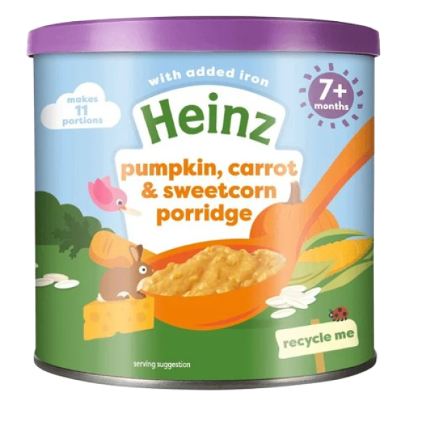 The Heinz Pumpkin, Carrot & Sweetcorn Porridge is a nutritious and delicious baby food designed for infants 6 months and older. Made from carefully selected vegetables like pumpkin, carrot, and sweetcorn, it provides a naturally sweet taste that babies enjoy while delivering essential vitamins and minerals for healthy growth. The smooth texture makes it easy for little ones to eat and digest, supporting the transition to solid foods. Free from artificial colors, flavors, and preservatives, this porridge is a wholesome choice for parents looking for convenient, safe, and tasty nutrition for their babies.