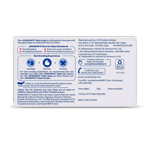 • The JOHNSON'S® Baby Soap bar cleanses gently, so you can use it anytime you bathe your baby.