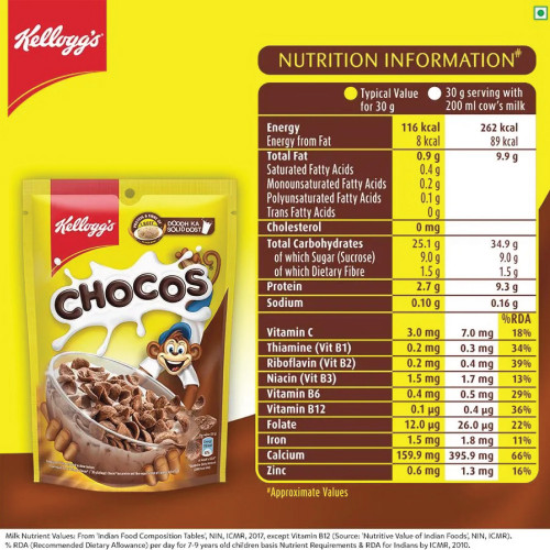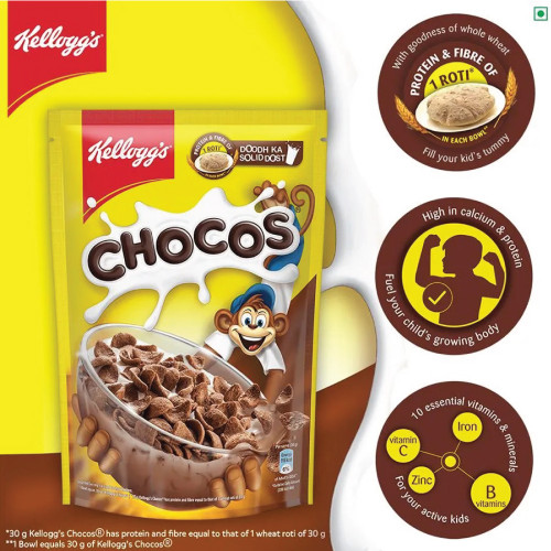 • Kellogg's Chocos is a Solid & Nourishing food for your kids. One serve of 30g of Kellogg's Chocos has the protein & fiber of 1 Wheat Roti of 30g. It is enriched with 10 essential vitamins and minerals.
