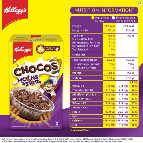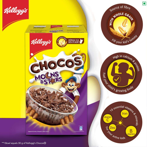 - Kellogg’s chocos moons and Stars has a taste that’s out of this world. Moons and stars shaped chocos mixed with milk create a galaxy in every bowl. Great for breakfast, they make morning’s fun, giving kids a great start to every school day.