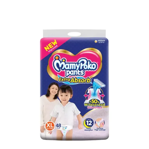 MamyPoko Pants XL (12–17 kg) – 48 Pcs, Made in India, are specially designed to keep your baby dry, comfortable, and active throughout the day. These diaper pants feature a soft and breathable inner layer that is gentle on delicate skin and helps prevent irritation. The high-absorbency core quickly locks away wetness to provide reliable leakage protection for both daytime and overnight use. With a flexible waistband and easy pull-on design, they ensure a snug yet comfortable fit, allowing free movement. Ideal for babies weighing 12–17 kg, this 48-piece value pack is a convenient and economical choice for daily diaper care.