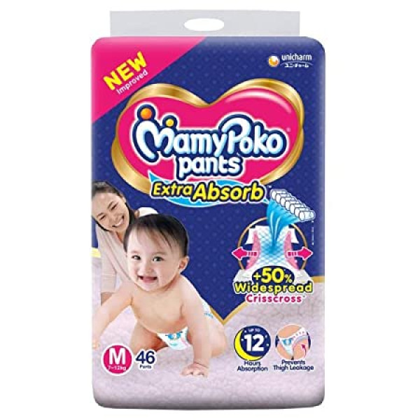 MamyPoko Pants Medium 7–12 Kg 46 Pcs, made in India, are thoughtfully designed to keep your baby comfortable and dry throughout the day. These pant-style diapers feature an ultra-absorbent core that quickly locks in moisture, providing reliable protection and reducing the need for frequent changes. The soft, breathable material feels gentle against delicate skin, while the stretchy waistband and snug fit allow your baby to move freely without discomfort or leakage. Ideal for babies weighing between 7 and 12 kg, this medium size ensures a secure fit around the waist and legs. With 46 pieces in the pack, MamyPoko Pants Medium deliver excellent value for parents seeking dependable daytime and nighttime protection, freedom of movement, and premium comfort for their little ones.
