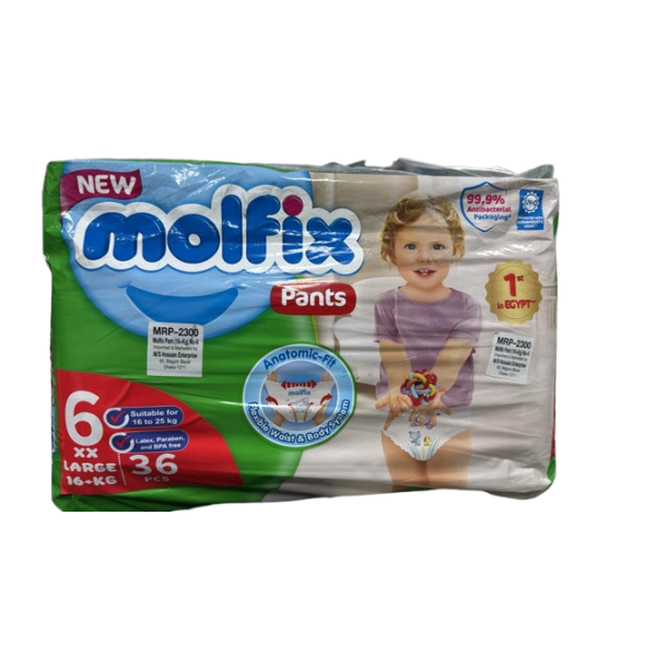 Molfix Super Advanced XXL (16+ Kg) 36 pcs Pant Diaper is specially designed for growing and active babies who need extra comfort and strong leak protection. If you are searching for Molfix XXL diaper price in Bangladesh, this 36-piece value pack offers reliable absorption, skin-friendly materials, and long-lasting dryness at an affordable price.