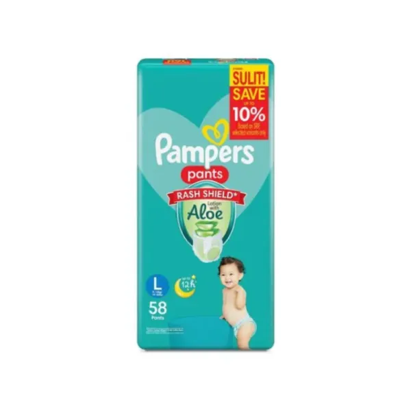 Pampers All Round Protection Pants Large 9–14 kg (58 pcs) offer a reliable and comfortable diapering solution designed specifically for active babies. These pant-style diapers are easy to slip on and remove, making them ideal for toddlers who are constantly on the move. Suitable for babies weighing between 9 to 14 kg, this Large size ensures a snug yet flexible fit that adapts to your child’s body for all-day comfort. Manufactured in India with Pampers’ trusted quality originating from the USA, these diapers are crafted to provide 360° protection against leaks, keeping your baby dry and happy. With a generous pack of 70 pieces, they offer long-lasting value for parents seeking dependable performance and softness for their little one’s delicate skin.