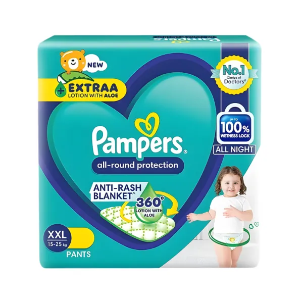 Pampers All Round Protection Pants XL (15-25kg, 38 Pcs) are designed to offer dependable comfort and dryness for active babies within the 15 to 25 kg weight range. Made in India under the trusted quality standards of a USA-origin brand, these pant-style diapers provide a snug yet gentle fit that allows little ones to move freely throughout the day. The all-round protection design ensures superior leakage control, while the soft, breathable materials keep your baby’s skin comfortable for long hours. Each packet contains 38 pieces, making it a convenient and economical choice for parents seeking reliable diapering solutions with international-quality assurance.