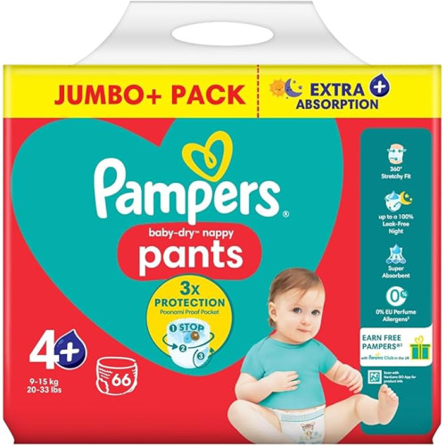 Pampers Baby‑Dry Pants Diapers Size 4 (66pcs) are designed to keep babies weighing 9–14kg dry, comfortable, and free to move. With an easy pull‑on design and flexible waistband, these pants make changing simple while providing a snug fit that adapts to every wiggle. The advanced absorption system locks away moisture for up to 12 hours of dryness, protecting delicate skin day and night. Soft, breathable materials ensure lasting comfort, while tear‑away sides allow quick and easy removal. Perfect for active little ones, this pack offers reliable protection and great value for parents./p>