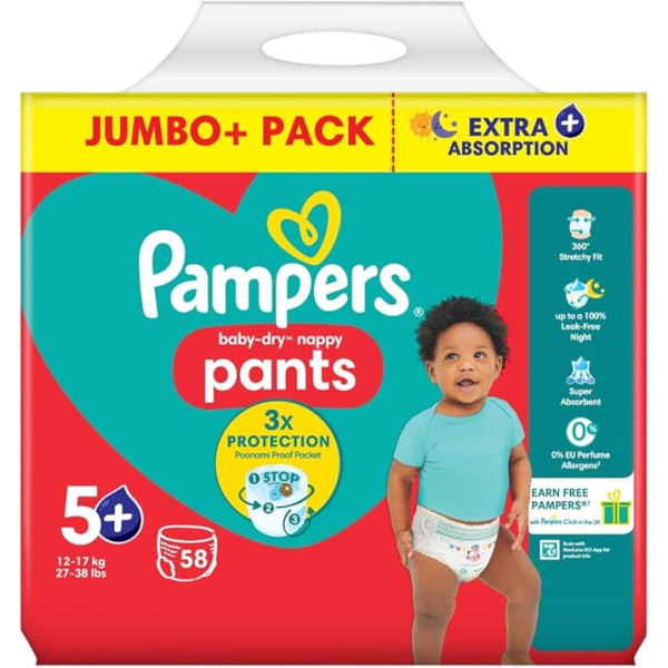 Pampers Pants Nappies Pull‑On Size 5 Junior (58 Pack) are designed for active toddlers weighing 11–16kg, offering easy wear and all‑day comfort. With a simple pull‑on design, these pants make changing quick and hassle‑free, while the flexible waistband ensures a snug yet gentle fit that adapts to every movement. Advanced absorption technology locks away moisture for up to 12 hours of dryness, keeping delicate skin protected. Soft, breathable materials provide lasting comfort, and the secure fit helps prevent leaks during playtime, naps, and overnight. This convenient 58‑pack gives parents reliable protection and value, while giving little ones the freedom to explore confidently.