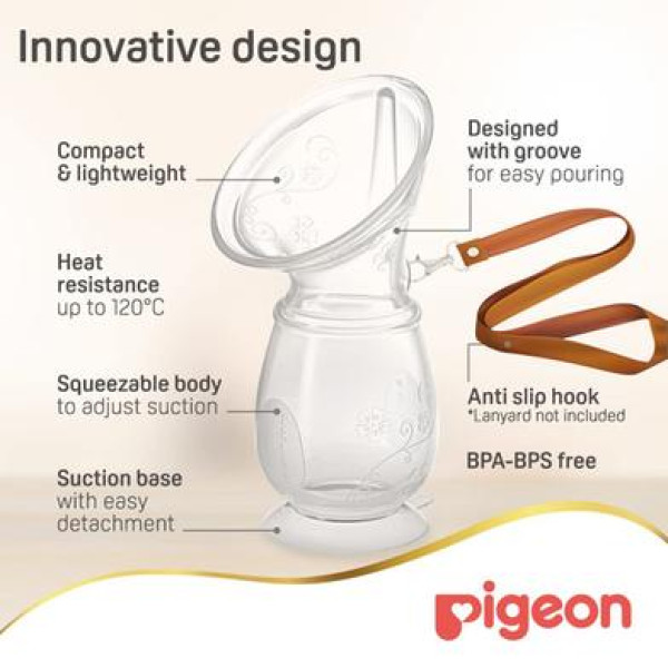 The Pigeon Milk Saver Pump – 26914 is a thoughtfully designed breastfeeding let-down milk catcher that helps mothers save precious breast milk that would otherwise be lost during the Milk Ejection Reflex (MER), when milk often leaks from the non-feeding breast. Made from 100% food-grade polypropylene and silicone, this BPA- and BPS-free pump ensures complete safety for both mother and baby, while its 110 ml capacity makes it ideal for collecting excess milk without mess or waste. The unique flange shape is specially engineered to create effective suction on the breast, making it the best breast milk catcher during breastfeeding, especially when the baby is latched onto one side. Its arch-shaped design prevents dripping, avoids dirt trapping, and allows for comfortable, hygienic cleaning, while the groove-designed spout enables easy and spill-free pouring of collected milk. The transparent body allows mothers to monitor milk volume easily, and the anti-slip hook lets moms attach their own lanyard for added stability and control during use. Additionally, the suction base with easy detachment enhances convenience and usability. Manufactured in Japan, the Pigeon Milk Saver Pump is not only a reliable breast milk saver but also a helpful solution for mothers experiencing breast engorgement, providing relief from discomfort while ensuring that no drop of valuable breast milk goes to waste.
