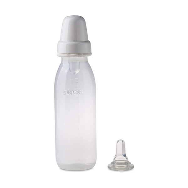 Pigeon Nursing Bottle PP for Cleft Palate is a specially designed baby feeding bottle to help infants with cleft palate or weak sucking strength feed more easily and comfortably. It is made from polypropylene (PP) material and typically comes in a 240 ml size, suitable for regular feeding volumes. The bottle uses a unique Y‑cut nipple that is thicker on one side and thinner on the other so that even babies who struggle to create suction can draw milk more easily. The nipple also includes a one‑way valve that prevents milk from flowing back into the bottle and helps maintain a smooth, steady milk flow only when the baby sucks or the bottle is gently squeezed. The design assists proper feeding for babies who find standard bottles difficult due to cleft palate challenges, and it usually includes both regular and small silicone nipples so you can choose the most suitable flow for your baby’s needs. This bottle can be sterilized by boiling, steam, or chemical methods for safe daily use.