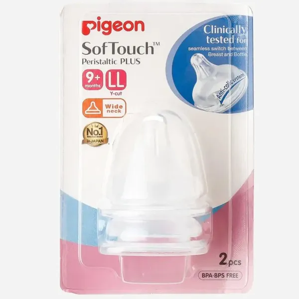 The Pigeon Softouch TM Peristaltic Plus Nipple in LL size with a Y‑cut is a silicone bottle nipple designed for babies aged around 9 months and older. It is made from super soft and flexible silicone that mimics the natural softness of a mother’s breast, allowing smooth tongue movement and a gentle yet effective latch. The Y‑cut opening provides variable milk flow that responds to the baby’s sucking strength, helping to reduce nipple confusion and support a comfortable transition between breast and bottle feeding. An anti‑colic system with an air valve helps reduce swallowed air, which can help minimize fussiness and gas during feeding. This blister pack includes two nipples and is compatible with wide‑neck Pigeon feeding bottles. The product is manufactured in Thailand and is suitable for continued feeding as your baby grows.